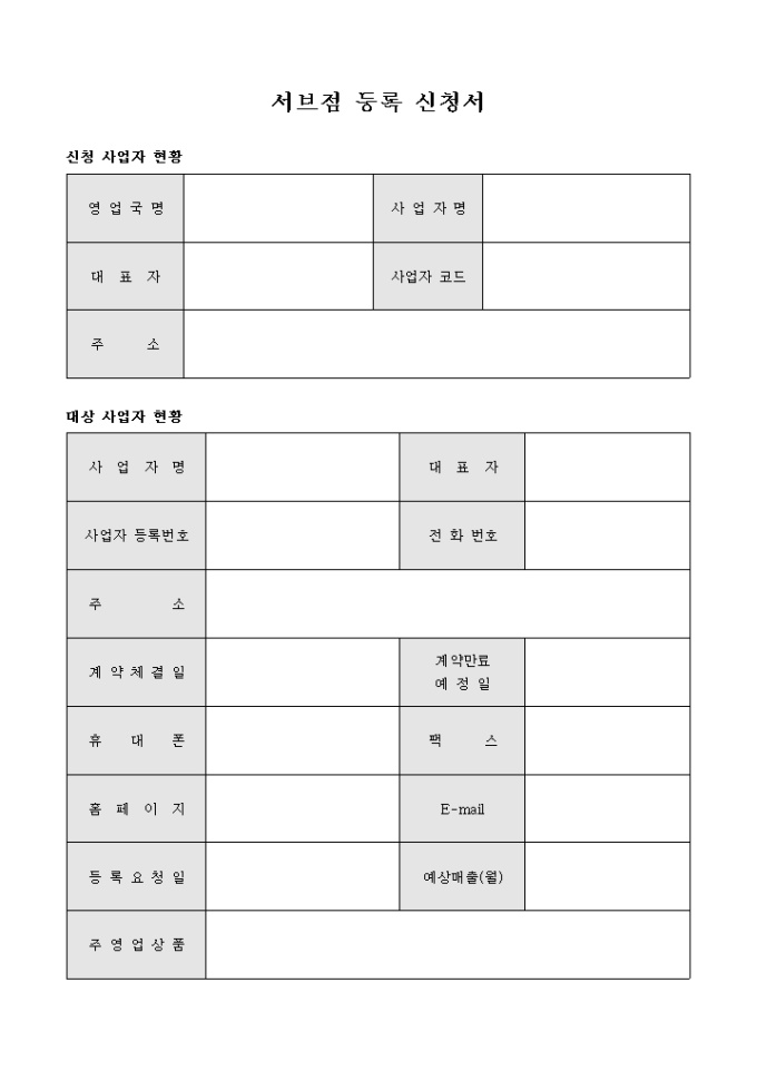 서브점 등록 신청시 사용됩니다. 신청 사업자 현황과 대상 사업자 현황등으로 구성되어 있습니다.