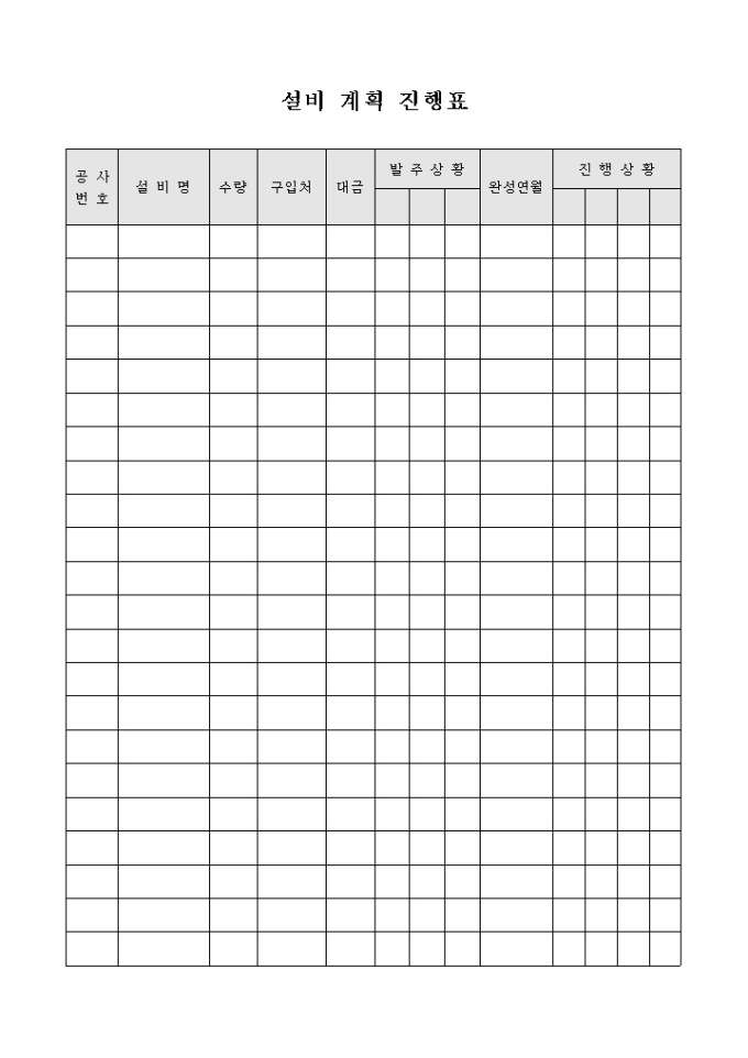 9,000원/월설비 진행에 관한 계획작성시 사용됩니다. 설비명과 발주사항, 완성연월별로 구성되어 있습니다.