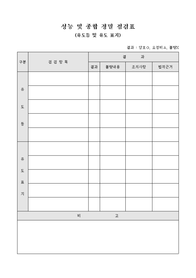 유도등 및 유도표지에 관한 점검항목을 기입하고 그에 따른 점검결과로 불량내용, 조치사항, 법적근거를 기입할 수 있는 유도등 및 유도표지 성능 및 종합 정밀 점검표 양식입니다.