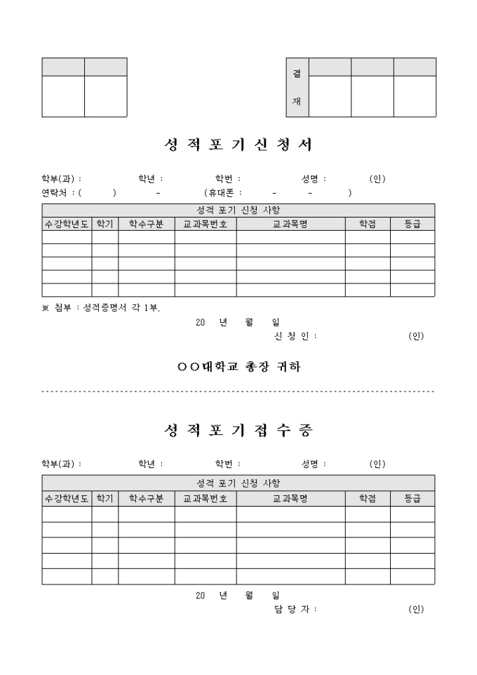 9,000원/월해당 과목의 성적 포기를 하기위한 성적포기 신청서와 그 내역을 접수했다는 내용의 성적포기 접수증 양식입니다. 신청자의 인적사항과 성적포기 하고자 하는 과목에 대해서 기재할 수 있습니다.