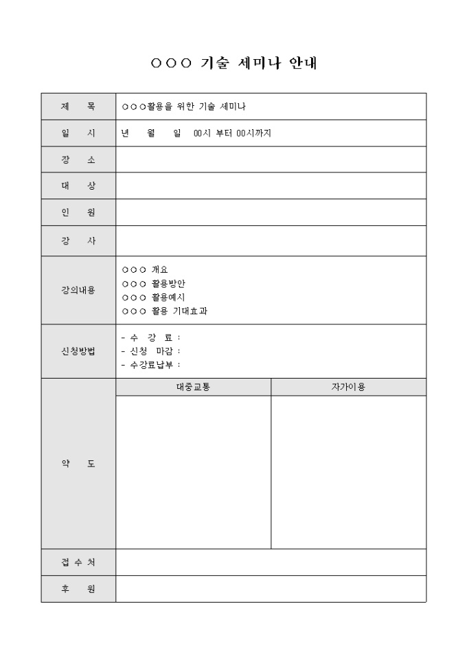 9,000원/월세미나 개최의 내용을 안내하기 위한 세미나 안내문 양식입니다. 세미나의 제목, 일시, 장소, 대상, 인원, 강사, 강의내용, 신청방법, 세미나 장소까지의 약도 등의 항목을 기재할 수 있습니다.