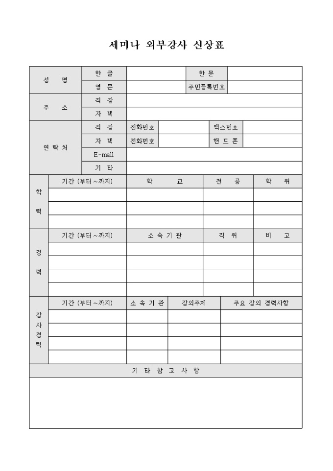 세미나 외부강사의 신상표입니다. 학력과 경력등을 확인할수 있으며 강사경력등을 기록할수 있습니다.