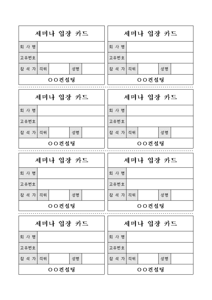 입장 인원이 제한된 세미나에서 입장 허가를 받았다는 증명을 할 수 있는 카드형식의 입장 카드로 8등분 되어 있는 서식입니다.