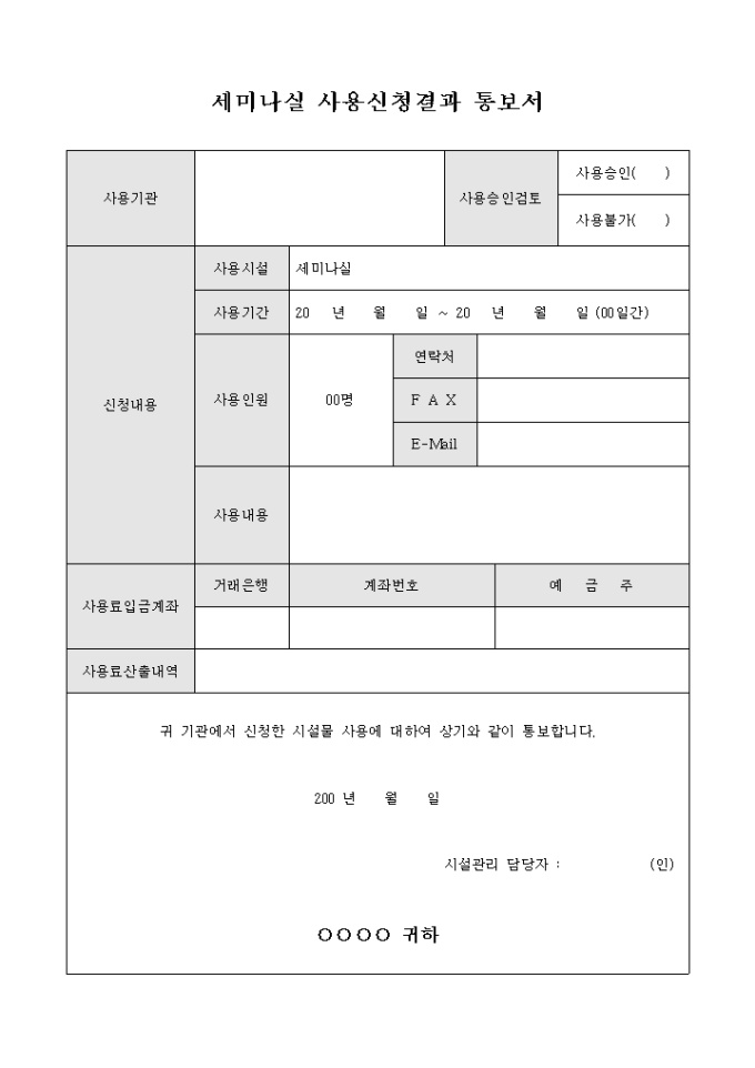 세미나실 사용 신청에 대한 결과 통보서 양식입니다. 사용기관과 사용승인검토, 신청내용, 사용료입금계좌, 사용료 산출내역 등의 항목을 작성하고 시설물 사용에 대하여 상기와 같이 통보한다는 내용의 세미나실 사용신청 결과 통보서 양식입니다.