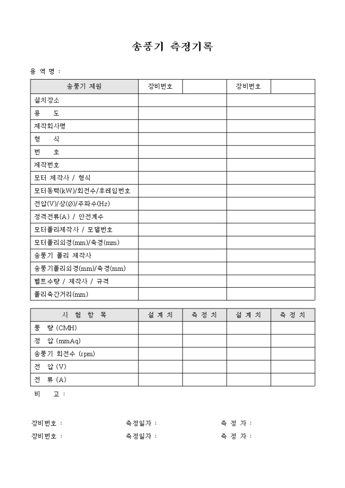 9,000원/월송풍기 제원 16개 항목과 송품기 시험항목 5개에 대하여 작성할 수 있는 송풍기 측정기록 양식입니다.