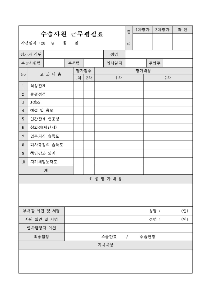 수습사원 근무와 관련된 고가내용을 평가할수 있는 수습사원 근무 평점표 입니다.