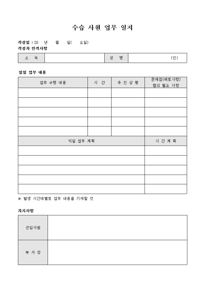 9,000원/월수습사원의 업무내용과 지시사항등을 기록할때 사용하는 업무일지 입니다. 업무 수행내용별 추진사항과 문제점등을 기록할수 있습니다.