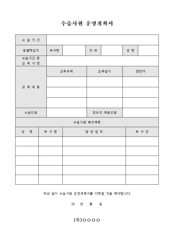 수습사원 운영 계획시 사용되는 문서입니다. 수습기간중 교육사항에 따른 수습사원 배치계획등을 세울수 있습니다.