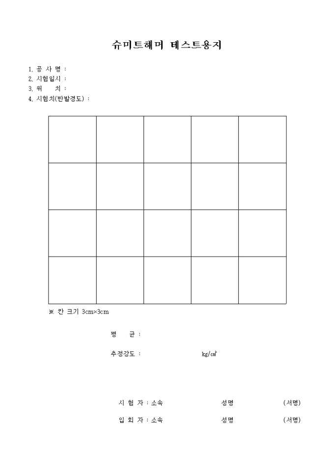9,000원/월공사명, 시험일지, 위치, 시험치의 사항을 기입할 수 있는 슈미트해머 테스트 용지입니다.