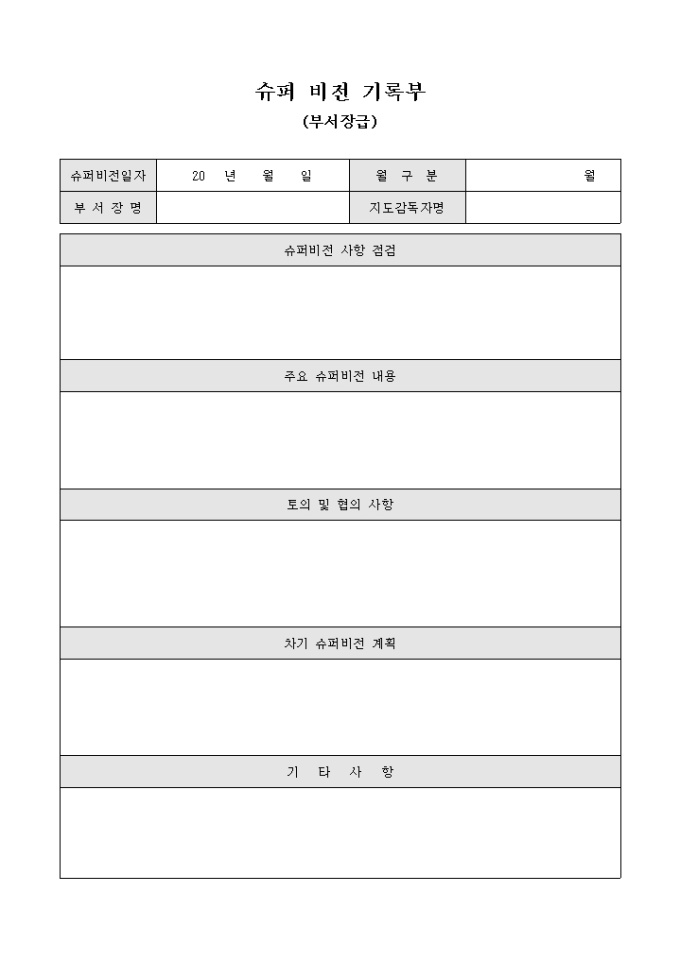 9,000원/월부서장급에서 사용하는 슈퍼비전 기록부 입니다. 슈퍼비전의 사항등을 점검하고 슈퍼비전계획등을 기록할때 사용합니다.
