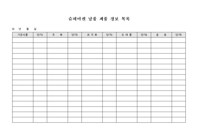 9,000원/월슈퍼마켓에 납품되는 제품의 정보를 기록하는 목록표 양식입니다. 항목별 단가 등을 기록할 수 있습니다.