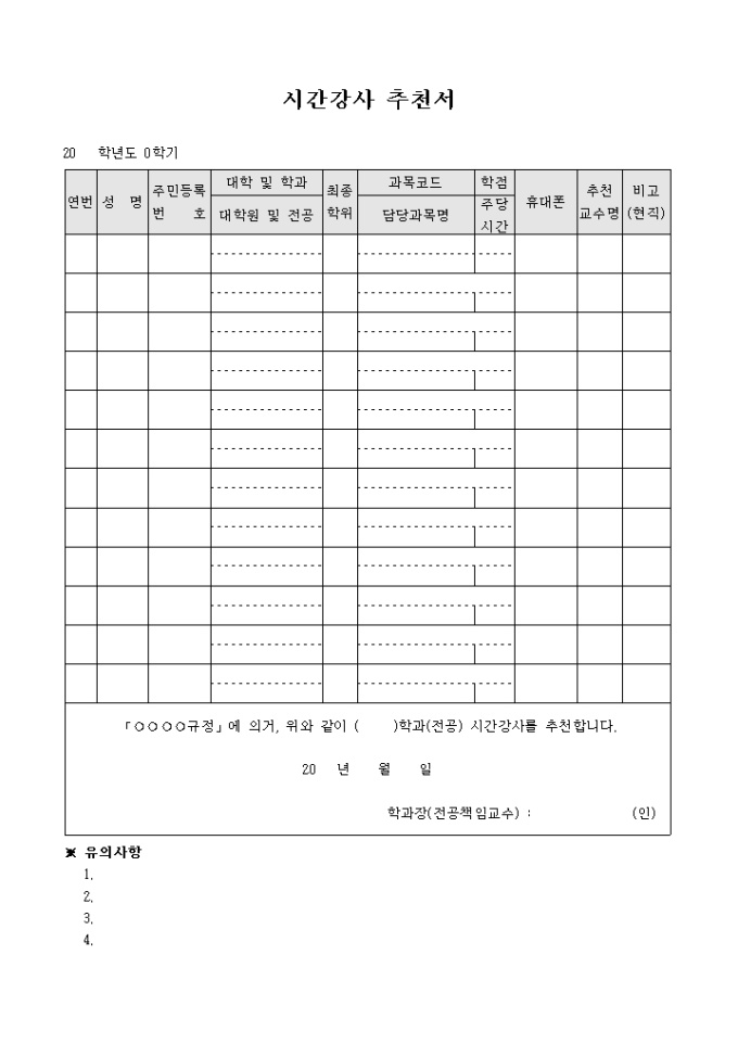 9,000원/월대학 강의를 진행하기 위한 시간 강사들을 추천하는 시간 강사 추천서 양식입니다. 시간 강사별로 성명, 주민등록번호, 대학,학과, 최종학위, 담당과목, 연락처, 추천교수명 등의 항목을 기재할 수 있습니다.
