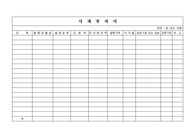9,000원/월사채명세서 양식입니다. 발행총액, 상환액, 미상환잔액, 발행가액, 이자율등으로 구성되어 있습니다.