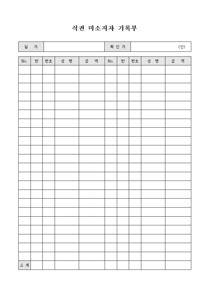 9,000원/월반, 번호, 성명, 금액에 따른 인적사항을 기입하여 관리할 수 있는 식권 미소지자 기록부입니다.