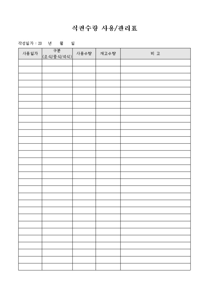 9,000원/월식권수량의 사용내용을 기록할때 사용하는 식권관리표입니다. 사용수량과 재고수량등을 파악할때 사용됩니다.