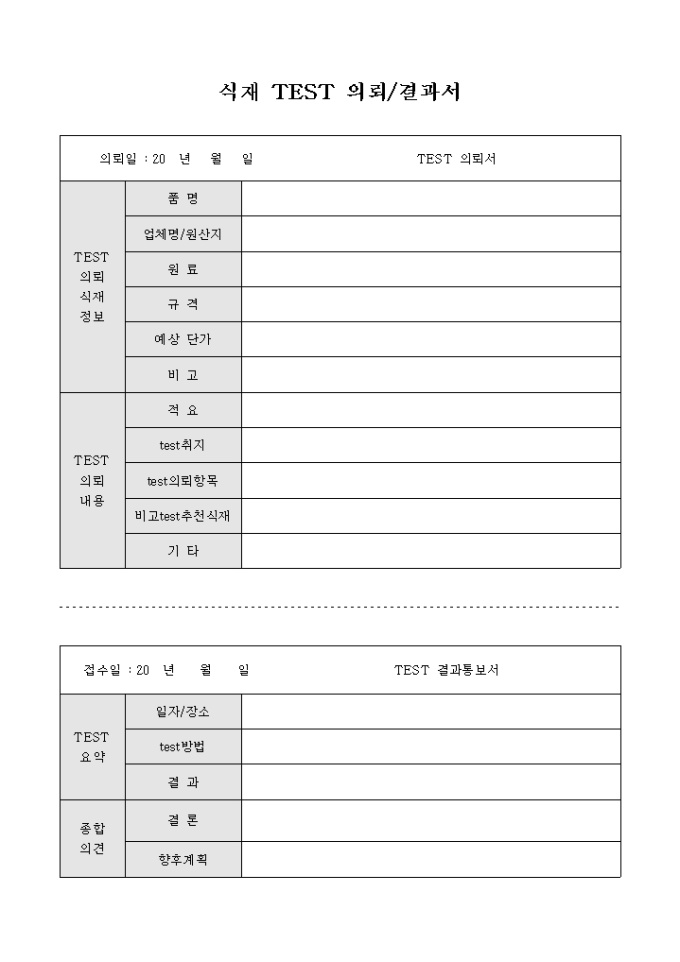 9,000원/월의뢰일, 품명, 업체명/원산지, 원료, 규격, 예상단가의 TEST의뢰식재 정보와 적요, TEST취지, TEST의뢰항목, TEST추천식재의 사항을 포함한 TEST 의뢰내용 및 TEST 요약과 종합의견으로 구성된 식재 TEST 의뢰 결과서로 2분할 되어 있습니다.