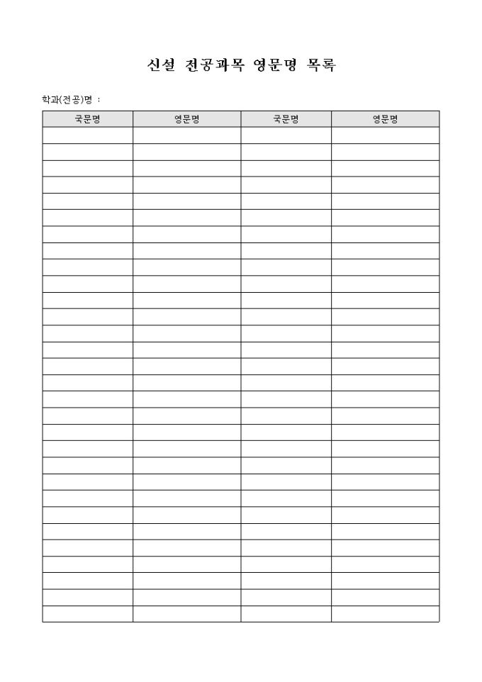 9,000원/월신설된 학과별 전공과목에 대하여 국문명 및 영문명의 목록을 기재할 수 있는 신설 전공과목 영문명 목록표 양식입니다.