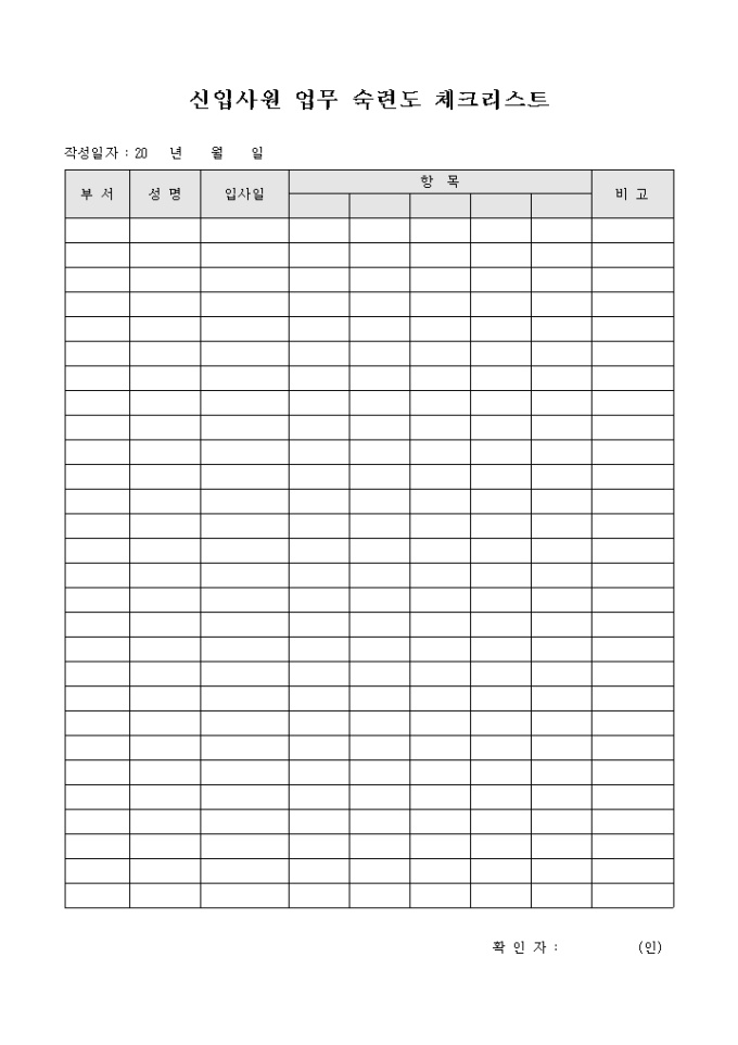 신입사원의 업무 숙련도를 확인하기 위하여 기록하는 체크리스트 입니다. 성명, 입사일, 항목으로 구성되어 있습니다.