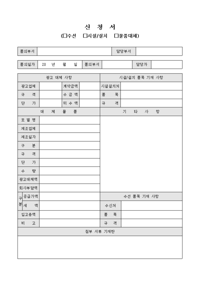9,000원/월수선, 시설설치, 물품대체 신청서 입니다. 대체물품의 내역과 수선품목 기재시 사용됩니다.