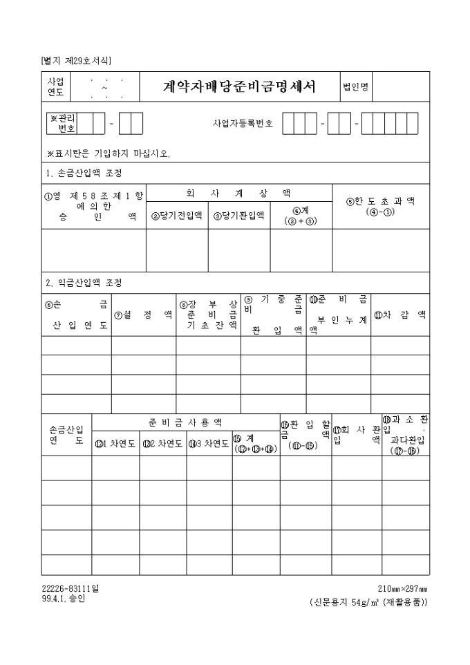 [별지 제29호 서식] 계약자배당준비금명세서 양식입니다. 1.손금산입액 조정 2.익금산입액 조정의 세부 항목으로 구성된 양식입니다.