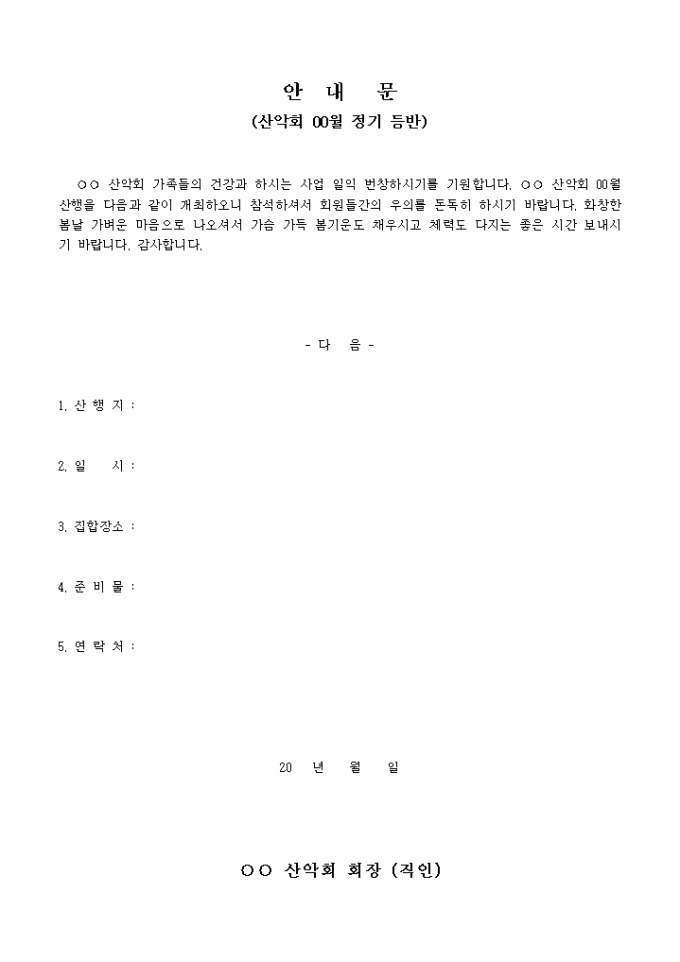 9,000원/월산악회의 정기등반에 관련된 내용을 알릴때 사용하는 안내문입니다. 일시와 장소와 준비물등을 확인할수 있습니다.