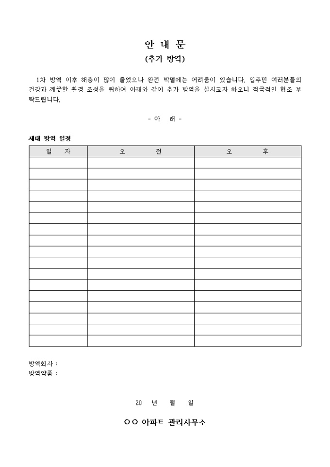 아파트 관리소에서 사용하는 추가방역 안내문입니다. 세대별로 방역일정등을 기록할수 있습니다.