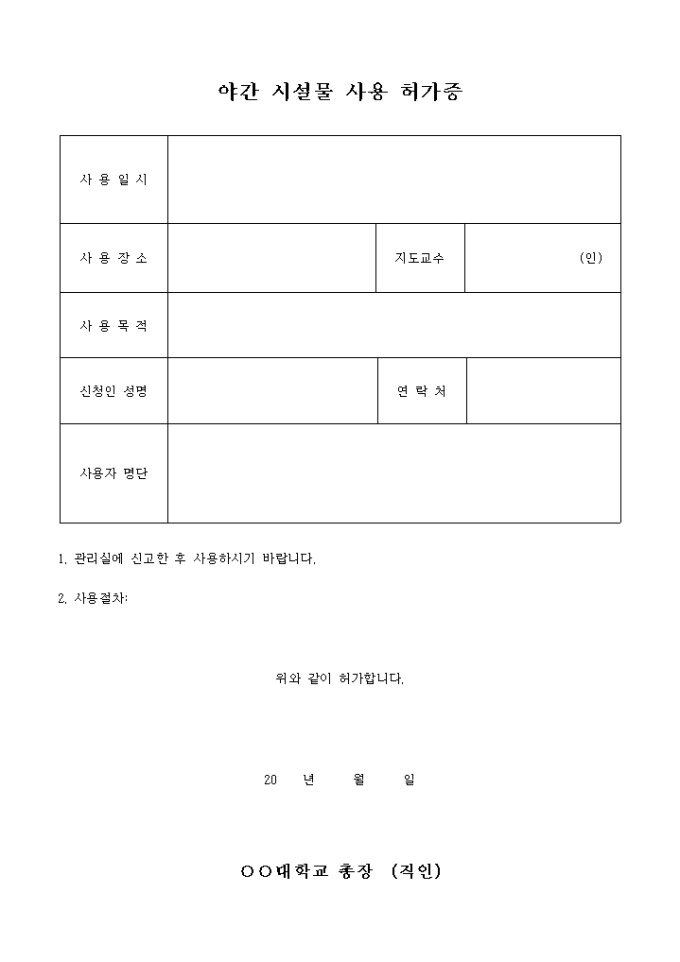 야간 시설물의 사용을 하가하는 야간 시설물 사용 허가증 양식입니다. 사용일시, 사용장소, 지도교수, 사용목적, 신청인 성명, 연락처, 사용자 명단 등의 항목으로 구성되어 있습니다.