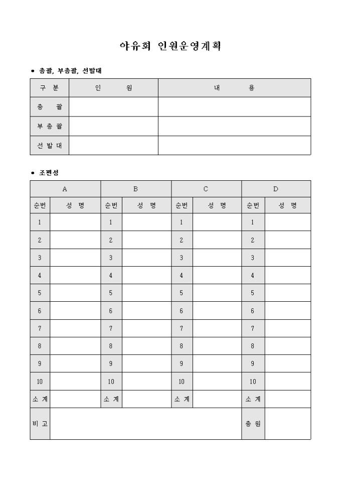 9,000원/월야유회 참석 인원의 조편성시 사용되는 운영계획서 입니다. 조별 참석인원등을 기록할수 있습니다.