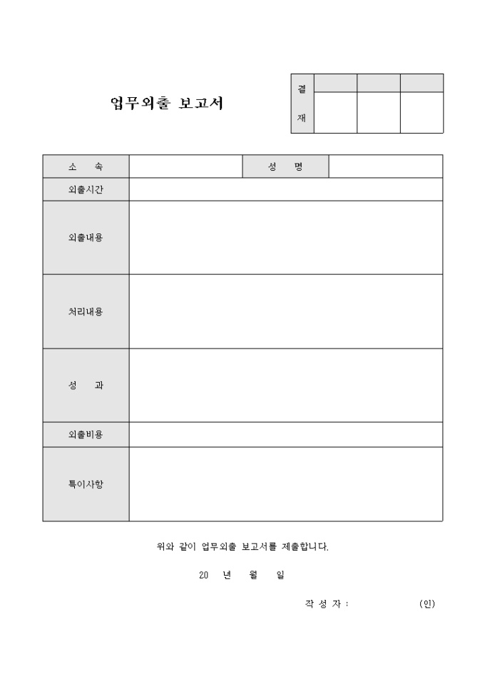 업무 외출의 처리내용과 특이사항등을 기록할때 사용하는 업무외출 보고서 입니다.