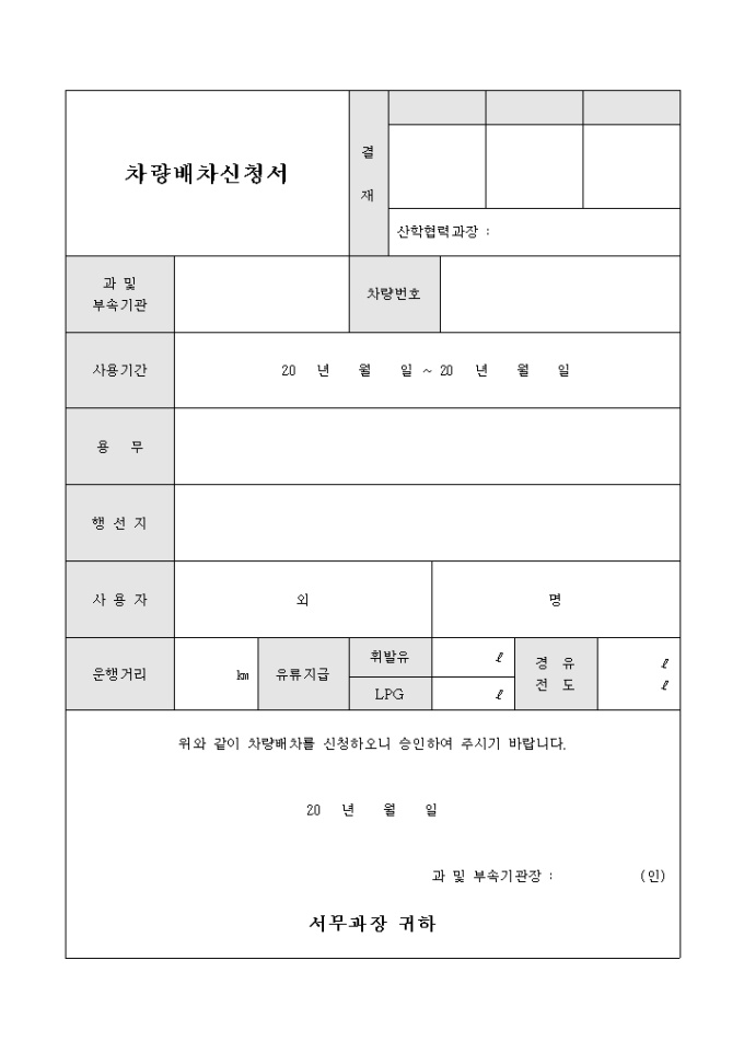 9,000원/월업무를 위한 차량배차신청서 양식입니다. 과 및 부속기관, 차량번호, 사용기간, 용무, 행선지, 사용자, 운행거리, 유류지급 등의 항목을 작성할 수 있습니다.