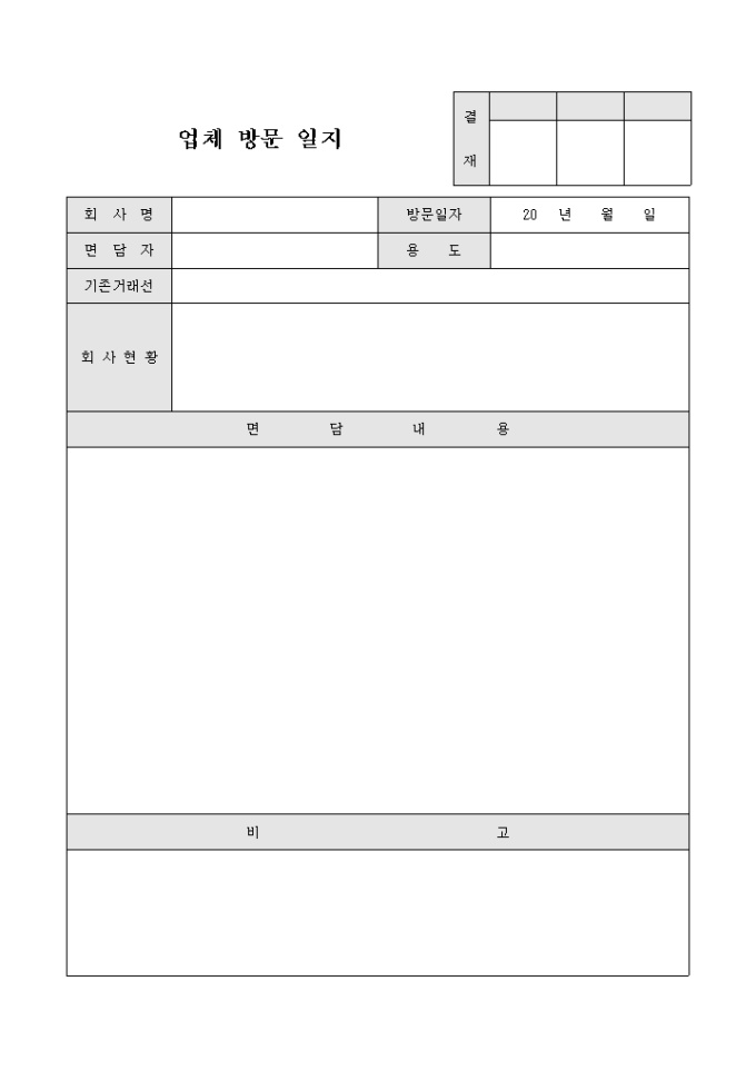 업체 방문시 방문 면담내용과 방문회사의 현황등을 기록할때 사용하는 업체 방문 일지 입니다.