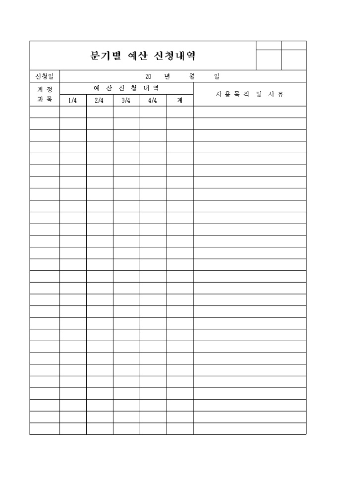 분기별 예산신청내역 양식입니다. 분기별 신청내역과 사용목적 및 사유로 구성되어 있습니다.