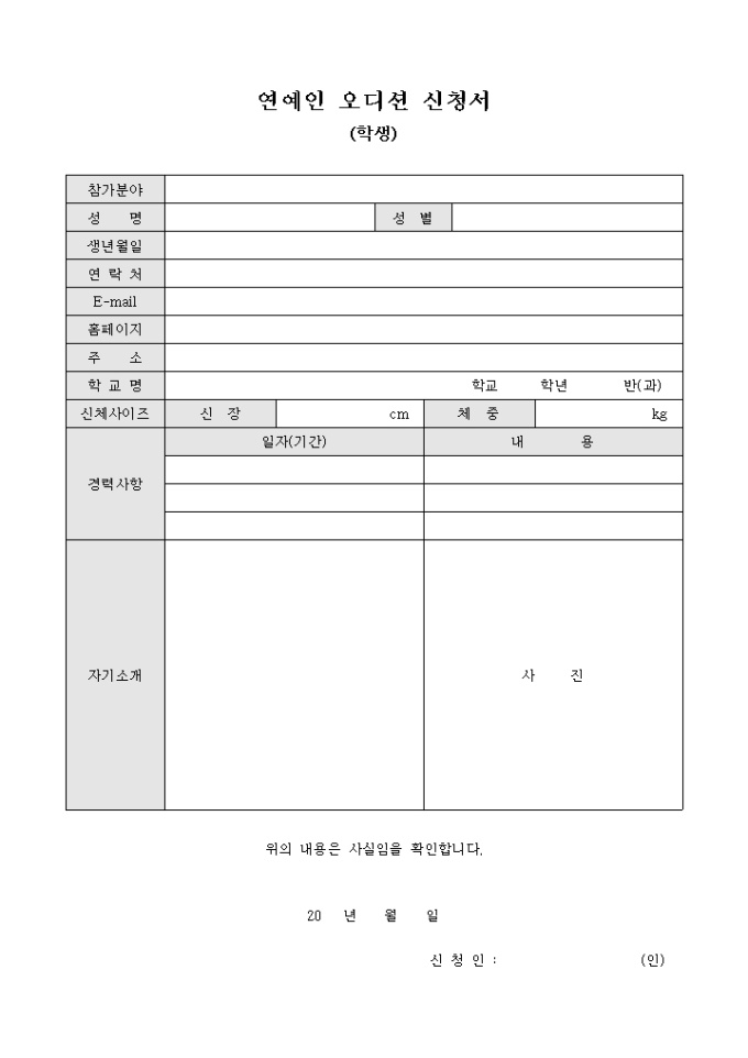 9,000원/월연예인 오디션 참가를 희망하는 학생을 위해 만들어졌으며 인적사항 및 경력사항, 사진 등을 부착할 수 있게끔 제작된 서식입니다.