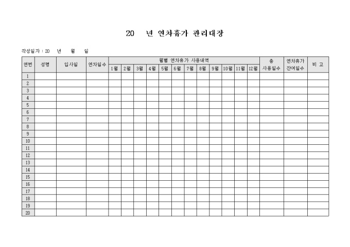 9,000원/월연차휴가의 월별 사용내역과 총 사용일수와 잔여일수등을 확인할수 있는 연차휴가 관리대장입니다.