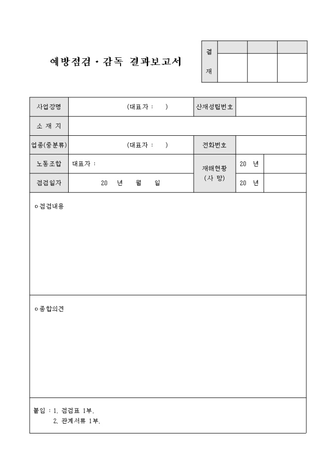 9,000원/월사업자명, 산재성립번호, 소재지, 업종, 전화번호, 노동조합, 재해현황, 점검일자의 사항을 기입하고 점검내용, 종합의견을 서술형태로 작성할 수 있도록 만든 예방 점검 감독 결과 보고서 양식입니다.