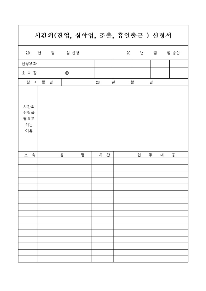 시간외(잔업, 심야업, 조출, 휴일출근)신청서 양식입니다. 신청사유와, 업무내용을 기록 관리하는데 사용하십시요.