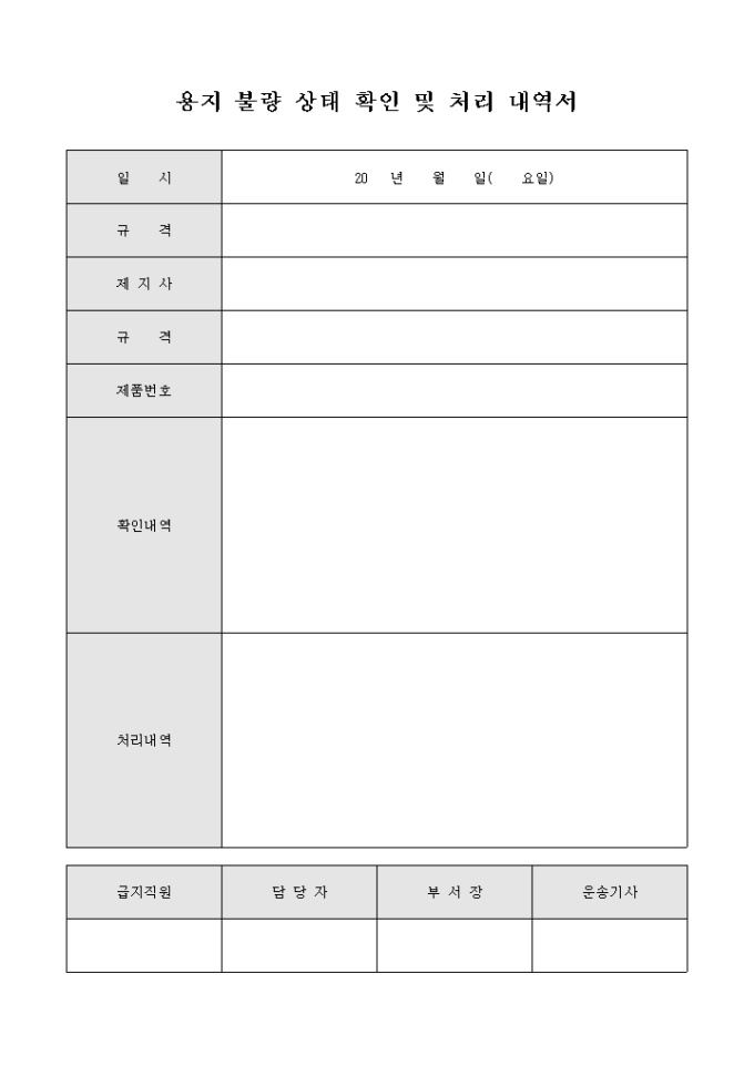 9,000원/월용지 불량 상태 확인 및 처리 내역서 입니다. 용지불량상태의 확인내역과 처리내역등을 기록할수 있습니다.