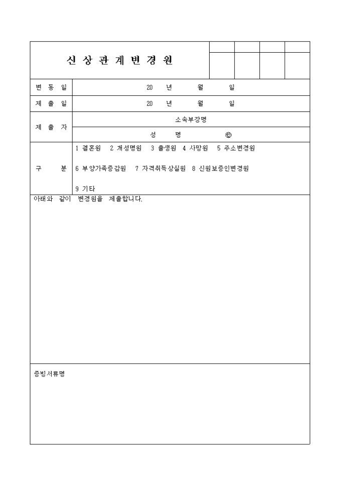 신상관계변경원 양식입니다. 아래와 같이 변경의 경우 사용하십시요. 1 결혼원 2 개성명원 3 출생원 4 사망원 5 주소변경원 6 부양가족증감원 7 자격취득상실원 8 신원보증인변경원 9 기타