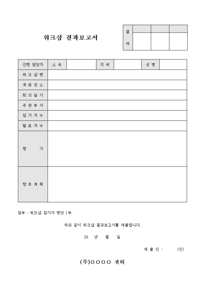 9,000원/월워크샵의 결과를 평가하고자 할때 사용하는 결과 보고서 입니다. 향후계획란을 통해 계획을 기록할수 있습니다.