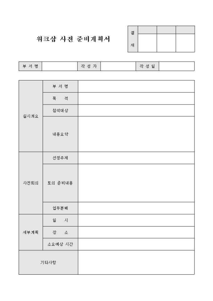 워크샵 사전 준비 계획서 입니다. 사전회의를 통한 계획작성시 사용됩니다.