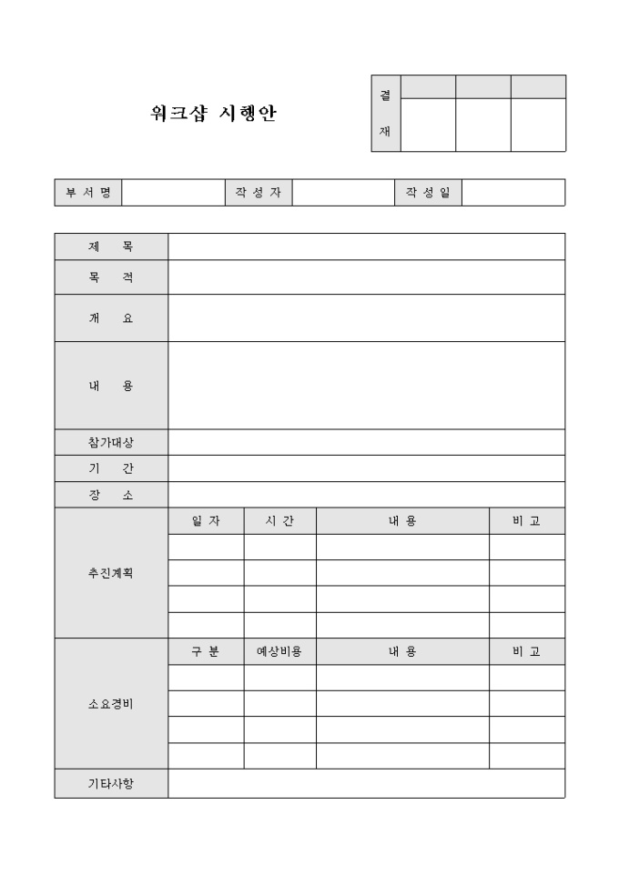 워크샵 시행안 입니다. 워크샵 추진계획과 소요경비등 워크샵 시행에 관련된 사항등을 기록할수 있습니다.