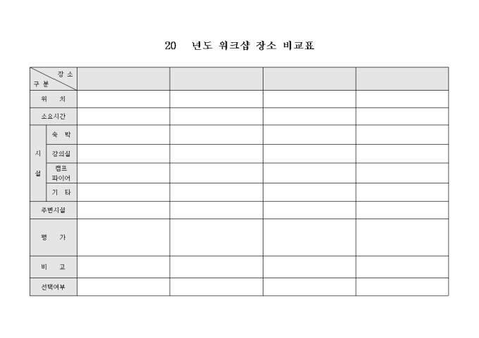 9,000원/월워크샵 진행에 필요한 장소섭외시 비교가 가능하도록 항목별로 구분해놓은 비교표 입니다.