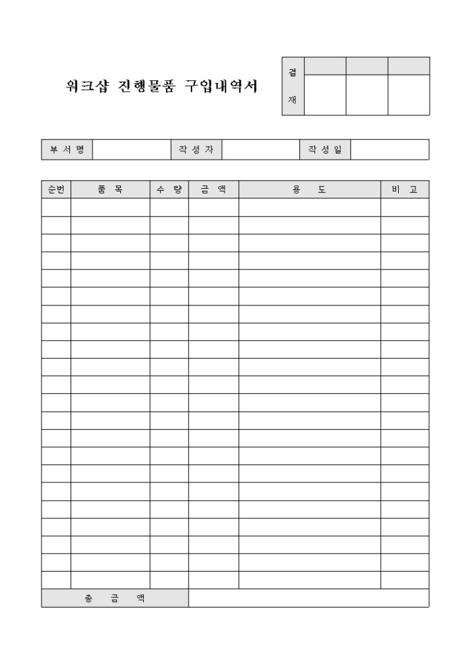 워크샵 진행에 필요한 물품을 구입할때 사용하는 물품구입 내역서 입니다. 품목별 용도등을 구입할수 있습니다.