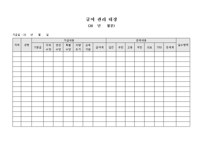 월간 급여 관리대장 입니다. 지급내용과 공제내용을 확인할수 있으며 실수력액등을 기록할수 있습니다.