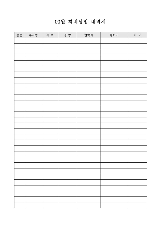 회비의 납입내역을 확인할수 있는 회비 납입서 입니다. 연락처, 성명, 월회비등으로 구성되어 있습니다.