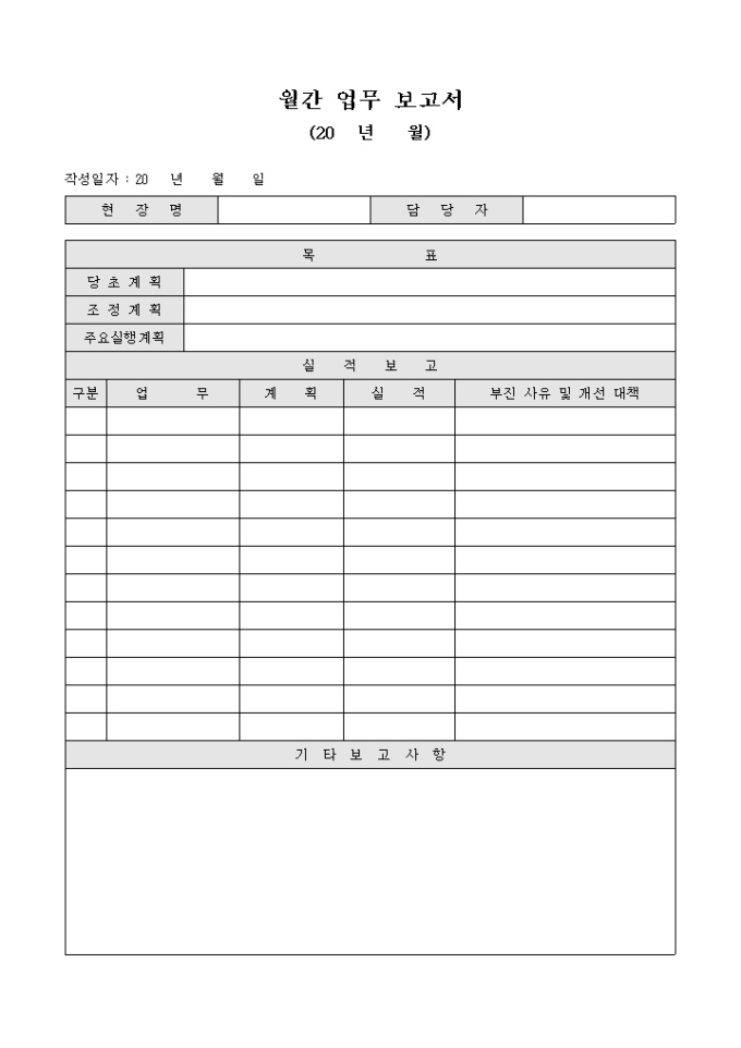 월간 목표와 실적에 대한 업무 보고시 사용되는 업무보고서 입니다.