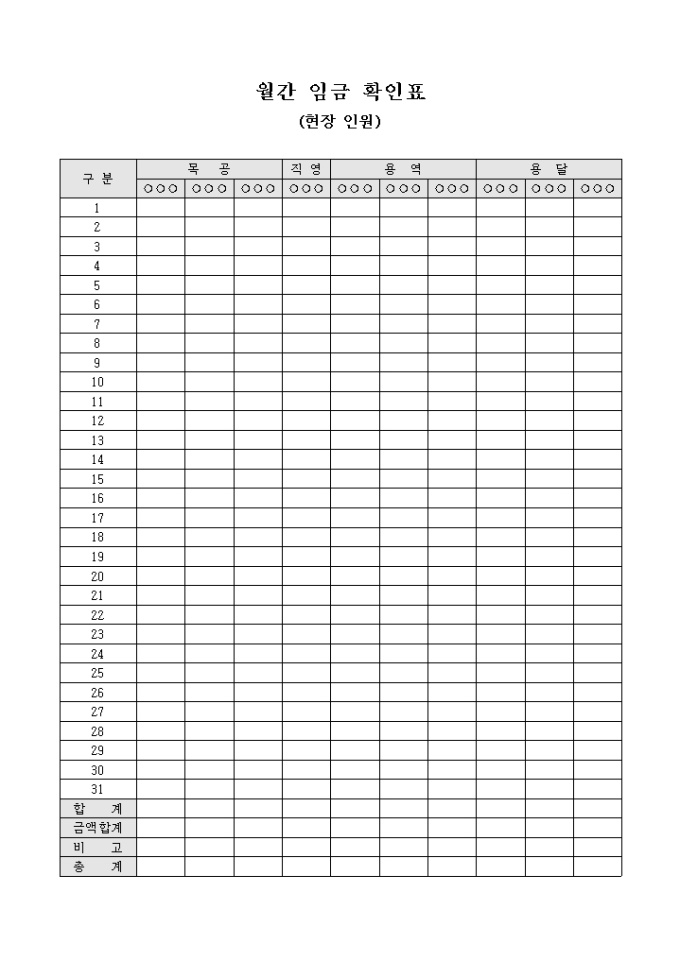 9,000원/월현장인원의 월간 임근확인시 사용되는 임금확인표 입니다. 목공과 용역, 용달인원의 임금등을 기록할수 있습니다.