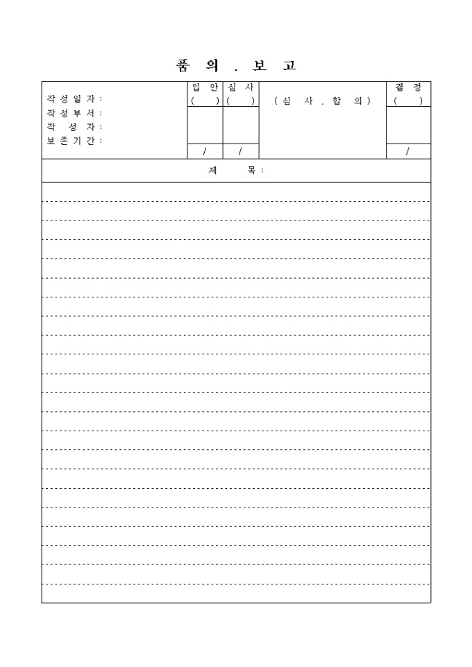 품의보고 양식입니다. 상부또는 관리 부서에 품의건에 관한 품의를 요청할시 사용하시는 서식입니다. 품의 내용은 기본적으로 육하원칙에 의하여 작성하시면 됩니다.