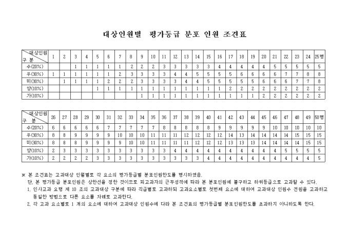 대상인원별 평가등급 분포인원 조견표