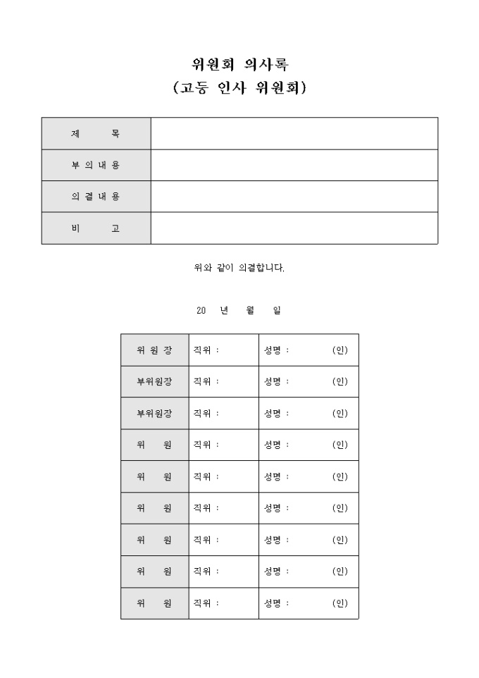 고등 인사 위원회에서 사용하는 위원회 의사록 입니다. 부의내용과 의결내용등을 기록할수 있습니다.